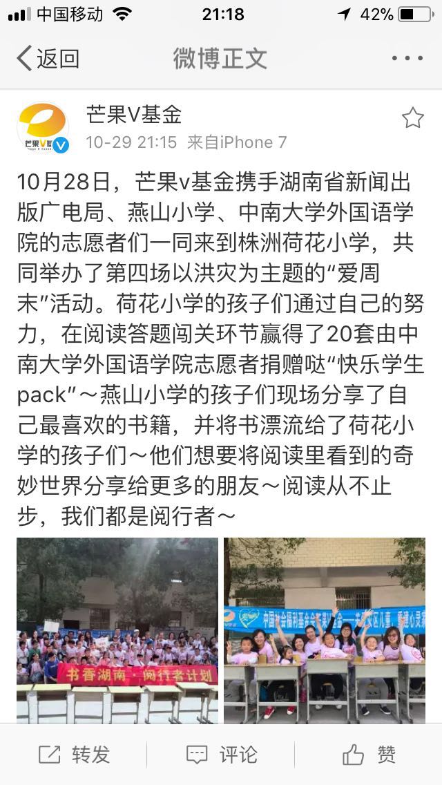 十月初,永利总站ylzz55教工三支部四支部的全体党员及教研室其他老师积极参与了芒果v基金“快乐学生pack”公益项目,共计捐款6200元,用于为株洲、安化两地的留守儿童购置学习用品及生活用品。1028日,教工四支部的党员志愿者们再次携手芒果v基金前往株洲醴陵荷花小学,举办了“快乐学生pack”衍生的以洪灾为主题的 书香湖南”爱心活动