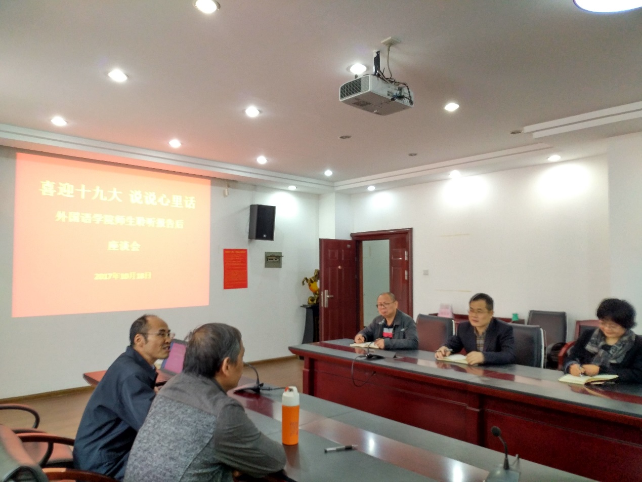 在其他师生发言后,陈广程书记最后对座谈会作了总结,并就如何学习党的十九大精神提出了要求。希望全体师生认真学习领会十九大报告精神,以务实作风主动学习、组织学习、结合本职学习、循序渐进,胸怀理想、坚定信念、勇于担当、践行社会主义核心价值观。希望广大外语院学子积极适应社会的发展变化,提高个人创新能力,不断学习新知识、掌握新技能、增长新本领、开阔新视野,努力成长为对国家、对社会、对人民有用的栋梁之才。