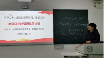 3月22日下午,两个党支部的党员相聚外语楼105教室,共同聆听院党委委员、副院长侯先绒以“学习二十大报告党建关键词、重要论断——推进以党建引领基层治理”为题讲的党课。侯先绒讲到,在高等教育领域,永利官网大学外语教育中心以教研室为基础的基层党支部应该结合大学外语教育教学这一中心工作,着力推进以党建引领基层治理,不断提升教学质量,培根铸魂,落实“立德树人”的根本任务。