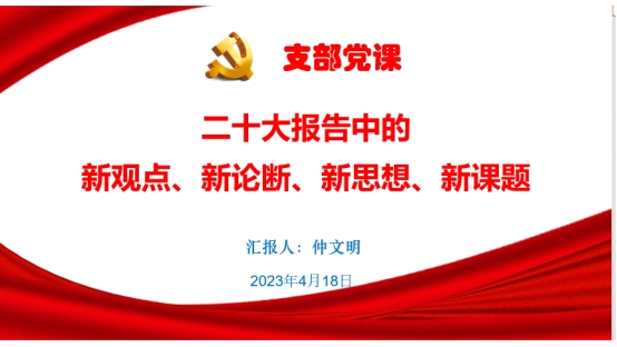 中国共产党二十大报告提出了全新的思想、理念和论断,推出了一系列新战略、新举措。深刻领悟二十大报告精神,是每一个党员提高政治理论水平和工作实践能力的必修课。为此,英语系党支部延续“人人上党课”的传统,4月19日下午,英语系党支部同志齐聚外语楼427教室,开展主题党日活动,邀请学院党委委员、副院长仲文明以“二十大报告中的新观点、新论断、新思想、新课题”为主题,为支部教师党员上了一堂生动的党课。