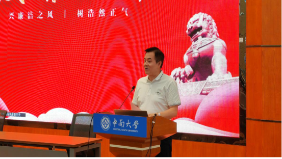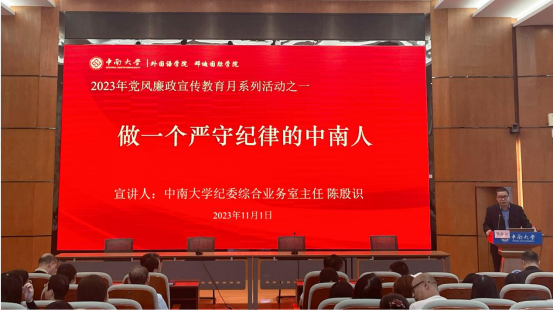 中南大学纪委综合业务室主任陈殷识以“做一个严守纪律的中南人”为题开展2023年党风廉政宣传教育,将理论知识与典型案例相结合,带领全体教职工强化知条规、懂纪律、慎言行的廉政意识。陈殷识强调党员须遵守政治纪律、群众纪律、组织纪律、工作纪律、廉洁纪律、生活纪律,以各高校负面案例为鉴,以先锋模范为榜样,用实际行动维护党的形象与威望,永葆共产党员的纯洁性。