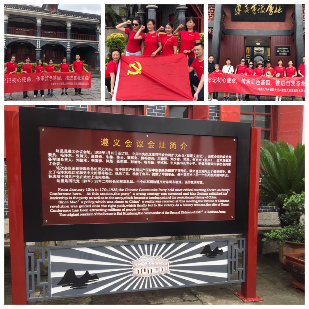 “红军不怕远征难,万水千山只等闲。五岭逶迤腾细浪,乌蒙磅礴走泥丸。金沙水拍云崖暖,大渡桥横铁索寒。更喜岷山千里雪,三军过后尽开颜。” 2019年7月13日,外语院大外四教党支部踏上红色长征路遵义行,接受红色革命精神的洗礼,开启我们的“不忘初心使命,传承红色基因,推进自我革命”的主题党日活动,旨在重温老前辈留下的精神遗产,缅怀他们的历史功绩,继承革命传统,弘扬红军精神。